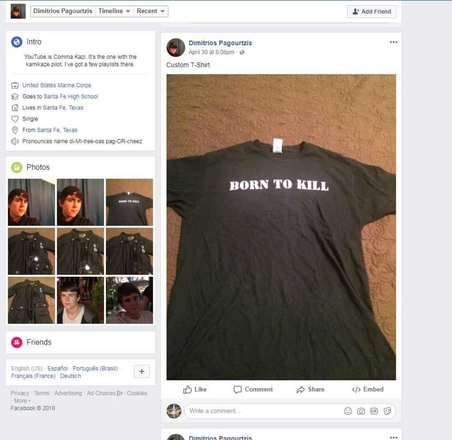 CNN пишет, что 30 апреля Пагуртзис опубликовал на своей странице в Facebook фотографию футболки с надписью «BORN TO KILL».