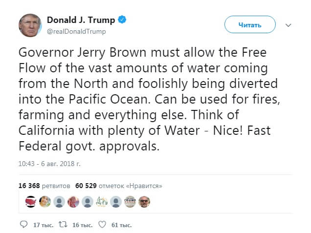 «Губернатор Джерри Браун должен разрешить свободный поток огромного объема воды, который приходит с севера и по глупости направляется в Тихий океан. Эту воду можно использовать для тушения пожаров, сельского хозяйства и всего остального. Только представьте Калифорнию с большим количеством воды — это прекрасно! Федеральное правительство быстро все утвердит», — написал Трамп в твиттере.