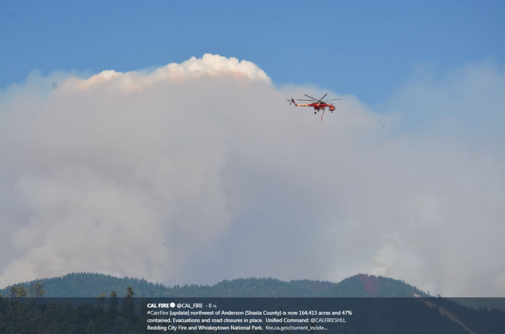 На севере, в округе Шаста, разгорается отдельный пожар, получивший название «Карр» (Carr fire). Он выжег 160 000 акров лесов, уничтожил более полутора тысяч строений и стал причиной смерти как минимум семи человек.
