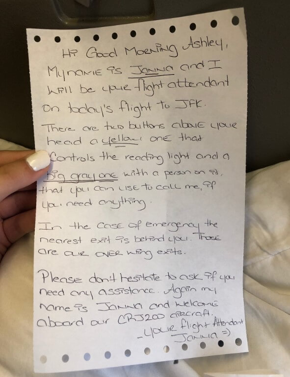 Эшли смогла успешно сесть на свой рейс Delta до JFK, и, к своему большому удивлению, получила рукописную записку от стюардессы, которая представилась как Джанна.