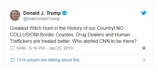 Президент назвал расследование «охотой на ведьм», а то, как отнеслись к Стоуну агенты ФБР при его аресте, сравнил с отношением к преступникам на границе, отметив, что к ним относятся лучше, чем к его давнему приятелю. Он также выдвинул несколько теорией заговора между ФБР и журналистами, которые ранним пятничным утром присутствовали при процедуре ареста Стоуна.