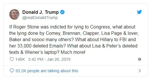 24 января 2019 года Минюст США обвинил близкого друга и бывшего советника Дональда Трампа Роджера Стоуна в препятствовании правосудию, лжи агентам ФБР и давлении на свидетелей. В пятницу, 25 января, он был арестован сотрудниками ФБР в своем доме во Флориде.