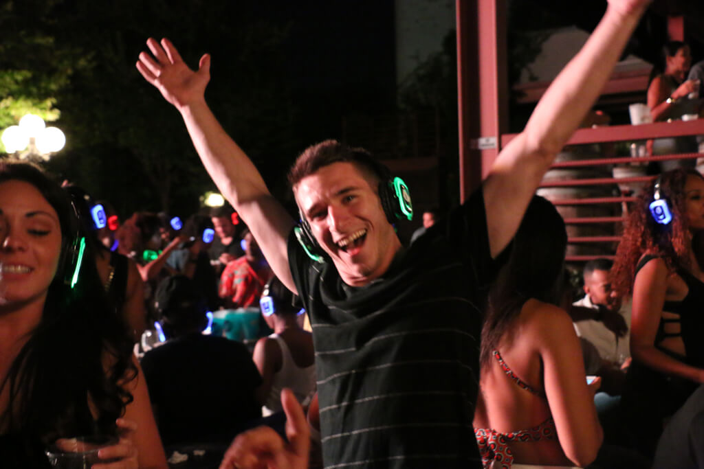 В 11:30 вечера на подъзде к бару под открытым небом «Bohemian Hall and Beer Garden» в Астории – тишина, хотя организаторы обещали тысячу человек. Заходим внутрь – так все уже здесь. Сотни абсолютно счастливых глаз и ушей: все вокруг танцуют в наушниках, причем наушники меняют цвет. Оказывается, есть три канала, на каждом свой диджей. Три цвета – три разных жанра. Синий – хаус, красный – девяностые, зеленый – хип-хоп. Переключатель в наушнике. Сразу хочется танцевать.