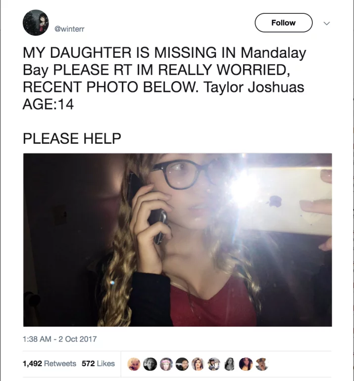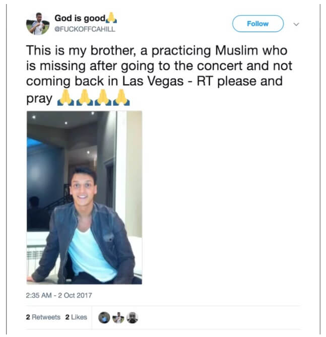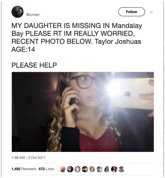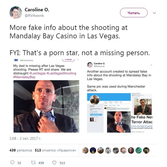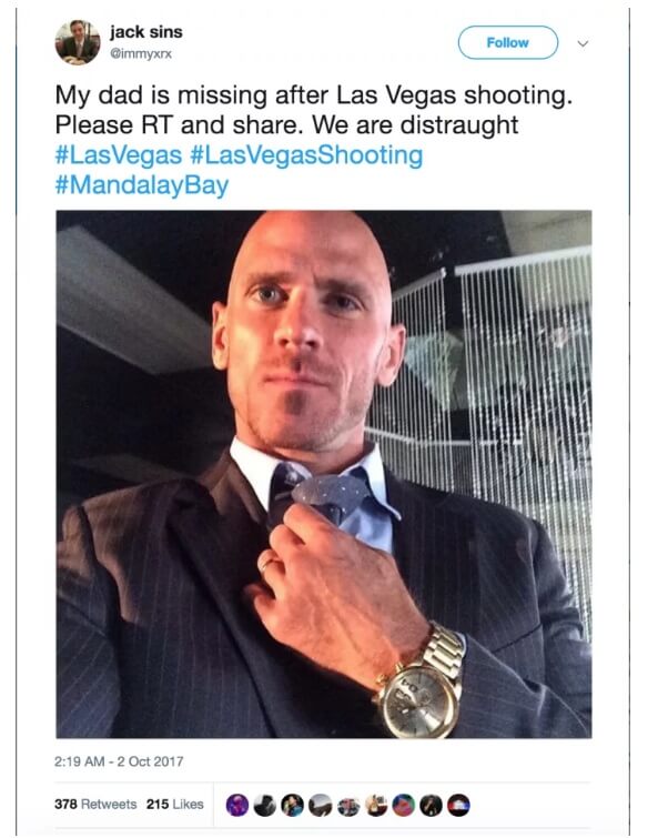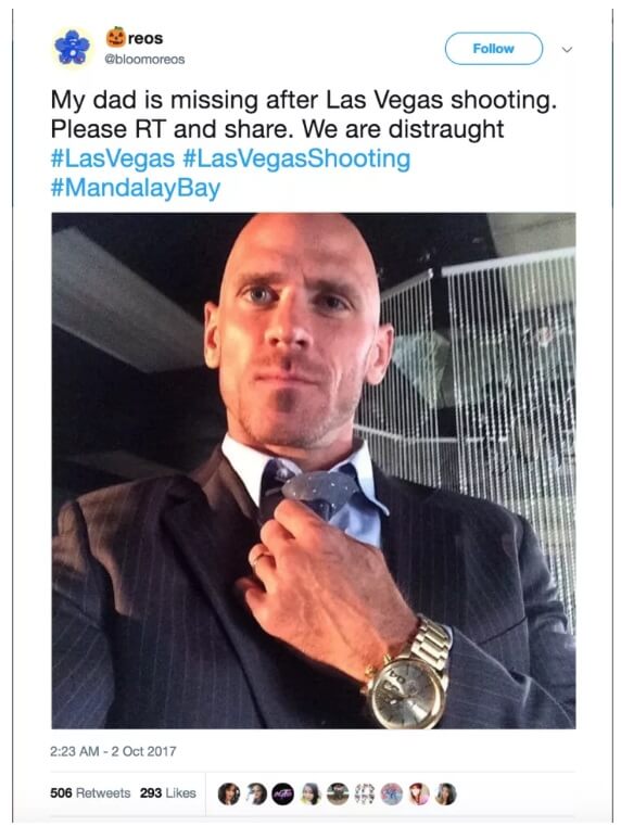 Возьмите этот твит от пользователя @bloomoreos, который утверждал, что его отец пропал без вести в Вегасе. Он стал вирусным с перепостом более 500 раз. Проблема в том, что фото на аватаре — это фотография кинозвезды Джонни Синса.