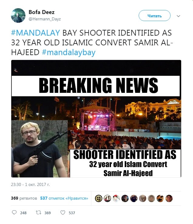 Другие учетные записи распространяли предполагаемые фотографии стрелка из Лас-Вегаса, которые на самом деле показывали комика Сэма Хайд. Его фотографии часто появляются в соцсетях после перестрелок.