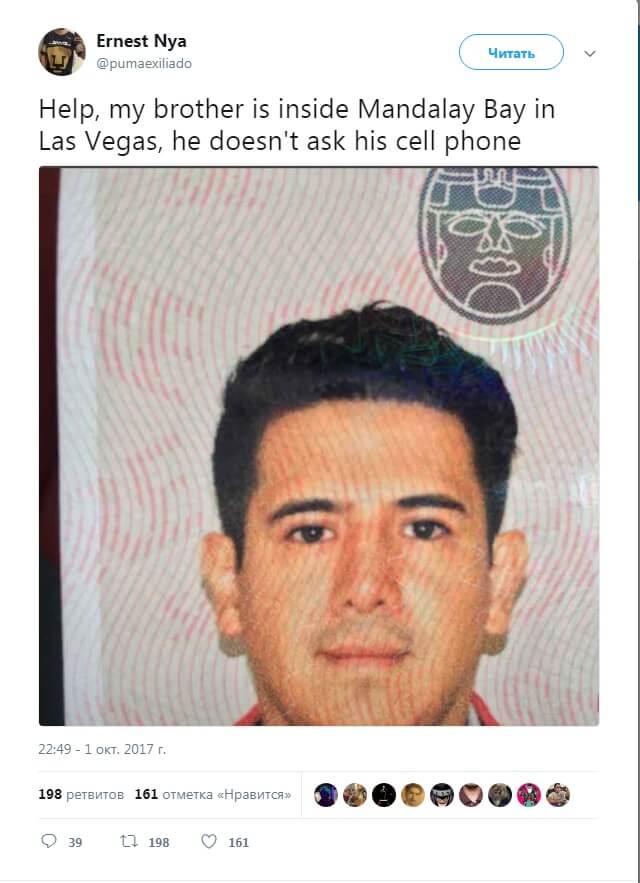 Вот пользователь, утверждающий, что его брат был в отеле Mandalay Bay, и «и его мобильный телефон не отвечает». Согласно сообщению Buzzfeed News, человек на фотографии связан с делом подростка, убитого в Мексике.