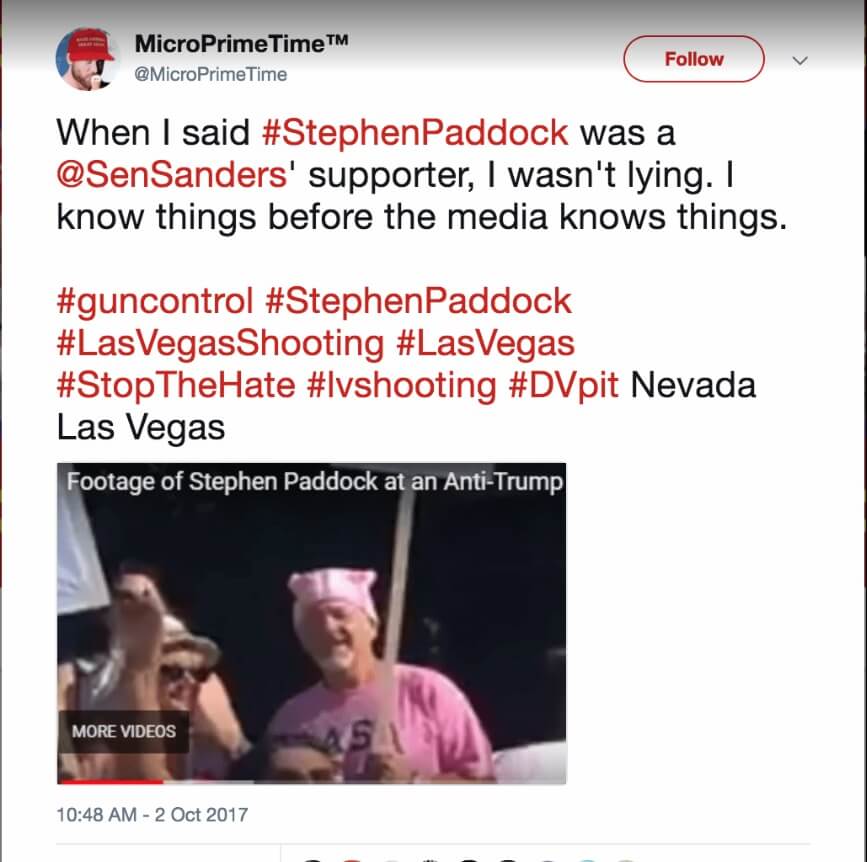 Позже он критиковал «либеральных критикующих глупцов», сообщая, что «я слушаю ПРЯМОЙ полицейский и надежный источник новостей». Полиция позже дискредитировала учетную запись Корта, утверждая, что Паддок не имел никаких связей с международными террористическими группами.
