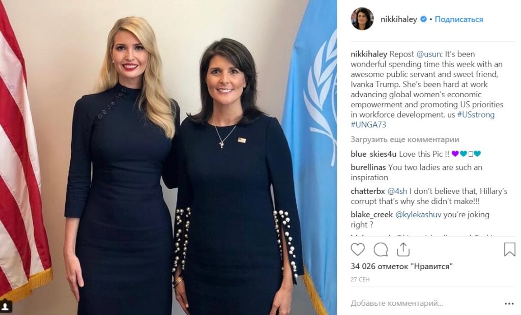«Посол Хейли служила Америке с достоинством и отличием. Она — смелый реформатор и была непоколебимым защитником правды, принципиального реализма и целостности в Организации Объединенных Наций. Мы с Джаредом благодарны за ее дружбу — настоящее благословение в нашей жизни!», — написала дочь президента.