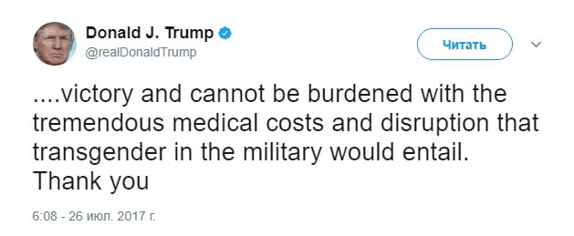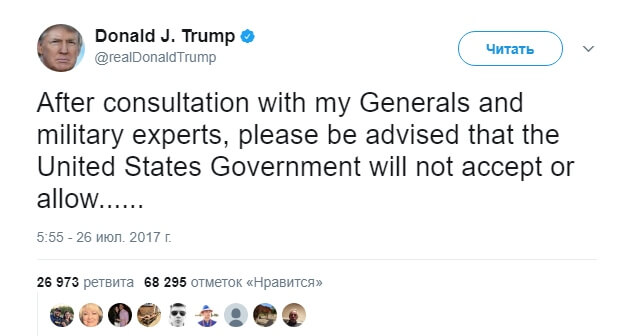 «Проконсультировавшись со своими генералами и военными экспертами, прошу учесть, что правительство Соединенных Штатов не позволит… трансгендерам служить в вооруженных силах США в каком-либо качестве», – написал Трамп в микроблоге.