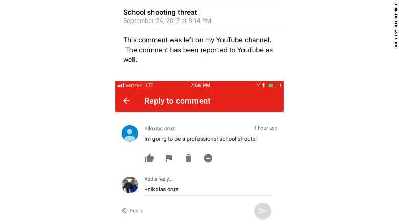 Сообщается также, что в сентябре ФБР получило предупреждение о возможной угрозе стрельбы в школе от пользователя YouTube с ником, аналогичным нику Круза.