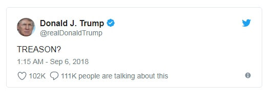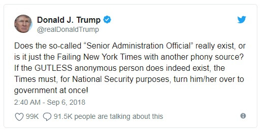 «Этот так называемый «высокопоставленный сотрудник» вообще существует или Деградирующая New York Times в очередной раз его выдумала? Если этот ЖАЛКИЙ аноним действительно существует, Times обязана раскрыть его правительству в интересах национальной безопасности!», – возмутился президент США в следующем твите (орфография и лексика авторская).