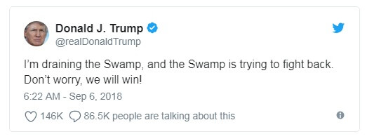 Последний твит использует слово Swamp. Этот термин и выражение «Deep state» («глубинное государство») сам Трамп и его сторонники используют для обозначения вашингтонской бюрократии. По их мнению, многие представители «Болота» якобы симпатизируют Демократической партии или просто не хотят видеть во власти лично Трампа, так как он «чужак», который не имеет связей с вашингтонским истеблишментом.
