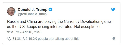 «Россия и Китай играют в девальвацию валют, в то время как США продолжают повышать процентные ставки. Это неприемлемо!», – написал Трамп в Twitter.