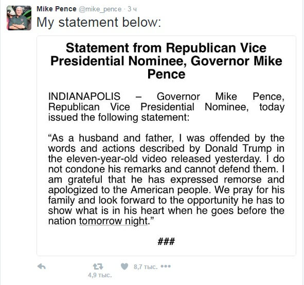 Майк Пенс, который в связке с Трампом борется за кресло вице-президента, заявил, что, как муж и отец, он тоже оскорблен этим видео, но рад, что Трамп выразил свое сожаление по поводу сказанного и извинился перед американцами.