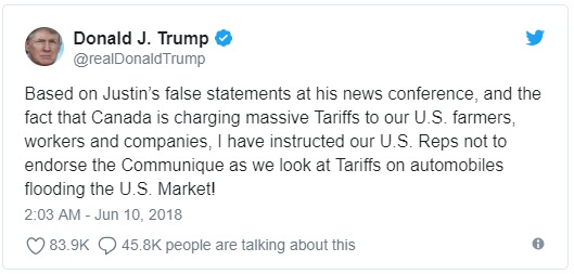 «Основываясь на ложных заявлениях Джастина на его пресс-конференции и на том факте, что Канада взимает огромные тарифы с наших американских фермеров, рабочих и компаний, я поручил нашим американским представителям не одобрять коммюнике», — заявил в ответ на это президент США. Вашингтон, по его словам, в настоящий момент «рассматривает возможность введения новых тарифов на автомобили, наводняющие американский рынок».