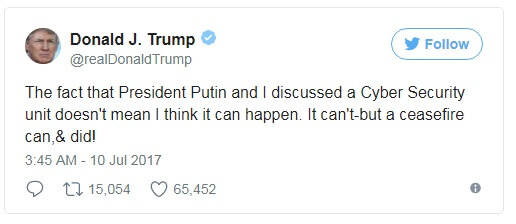 Президент США пояснил в Твиттере, что хотя идея создания совместной с Россией рабочей группы по кибербезопасности обсуждалась во время его встречи с президентом Путиным в Гамбурге, никаких конкретных договоренностей достигнуто не было.