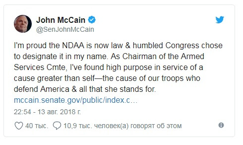 Сам Маккейн в Twitter написал, что испытывает гордость за то, что закон в итоге был подписан, и в то же время смущен, что документ получил его имя.