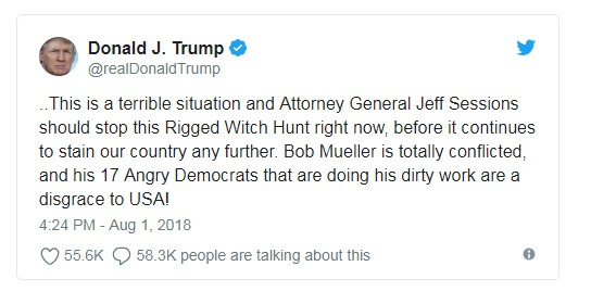 После серии твитов с критикой в адрес расследования спецпрокурора Мюллера Трамп написал: «Это ужасная ситуация, и генеральный прокурор Джефф Сешнс должен положить конец этой сфабрикованной охоте на ведьм немедленно, прежде чем это еще больше запятнает нашу страну. У Боба Мюллера явный конфликт интересов, а его 17 разгневанных демократов, которые делают за него грязную работу, позорят США!».