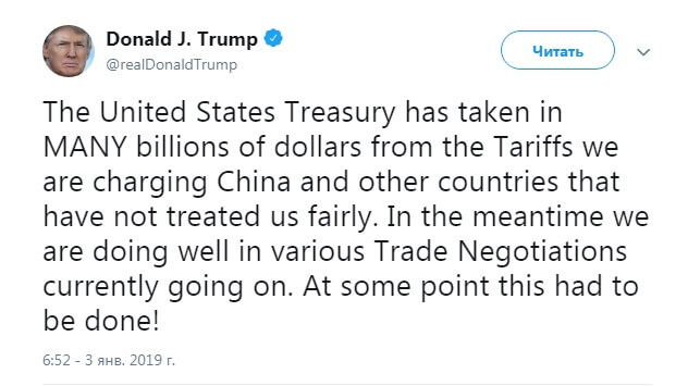 В начале декабря Трамп и председатель КНР Си Цзиньпин на встрече на полях саммита G20 в Аргентине договорились предпринять в течение трех месяцев шаги, нацеленные на заключение торгового соглашения между двумя государствами. При этом глава президент США заявил, что согласился с 1 января не повышать тарифы с 10% до 25% на китайскую продукцию на общую сумму $200 млрд, как он ранее планировал.