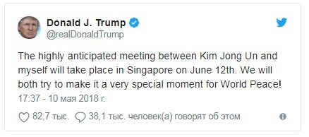 «Моя встреча с Ким Чен Ыном, которую многие ждут, состоится в Сингапуре 12 июня. Мы оба попытаемся сделать этот момент особенным для Мира во всем мире!» — написал Трамп в Twitter.
