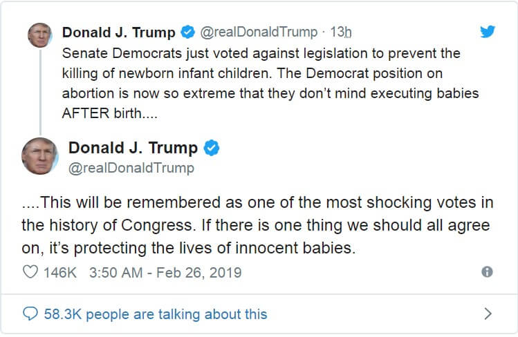 «Демократы Сената только что проголосовали против законопроекта, предотвращающего убийство новорожденных детей младшего возраста, — написал Трамп. — Позиция демократов в отношении абортов сейчас настолько экстремальна, что они не против казнить детей после рождения».