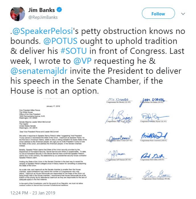 В прошлом месяце Пелоси пригласила Трампа выступить с ежегодным обращением 29 января. Однако для этого Палата должна была принять резолюцию, официально установив дату и время обращения. Пелоси не просила Палату рассмотреть такую резолюцию. На прошлой неделе она предложила Трампу отложить, отменить или перенести выступление из-за шатдауна, хотя официально не отменила приглашение.
