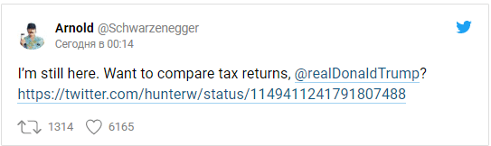 71-летний актер отреагировал почти сразу. Шварценеггер сообщил в Твиттере, что он «ещё здесь» и предложил сравнить налоговые декларации.
