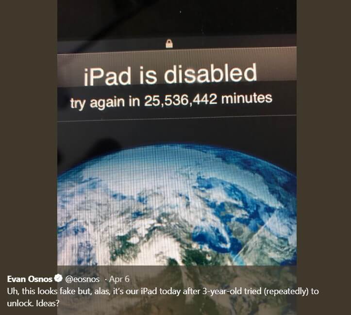 Эван Оснос, журналист из Вашингтона, округ Колумбия, обнаружил, что его iPad оказался заблокированным на 25 миллионов минут — или почти полвека. Сделал это трехлетний сын Эвана, попытавшись использовать планшет и многократно введя неправильный пароль.