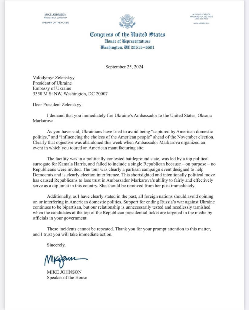 В публичном письме Джонсон потребовал, чтобы Зеленский уволил украинского посла Оксану Маркарову. Поводом стал визит Зеленского на прошлой неделе на завод по производству боеприпасов в Скрантоне, штат Пенсильвания, где украинский президент поблагодарил рабочих за поставку крайне необходимых снарядов Украине.