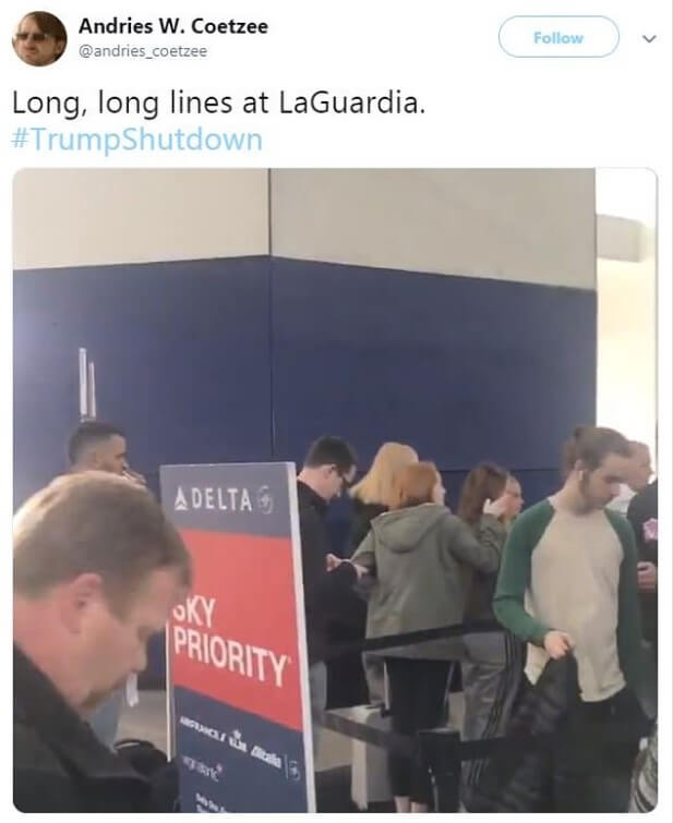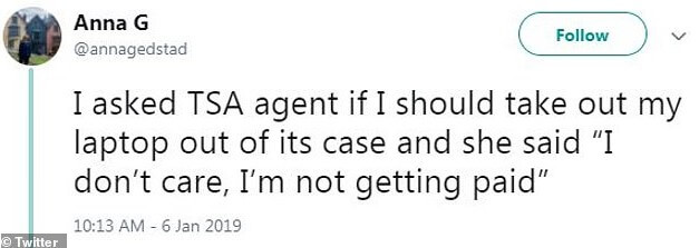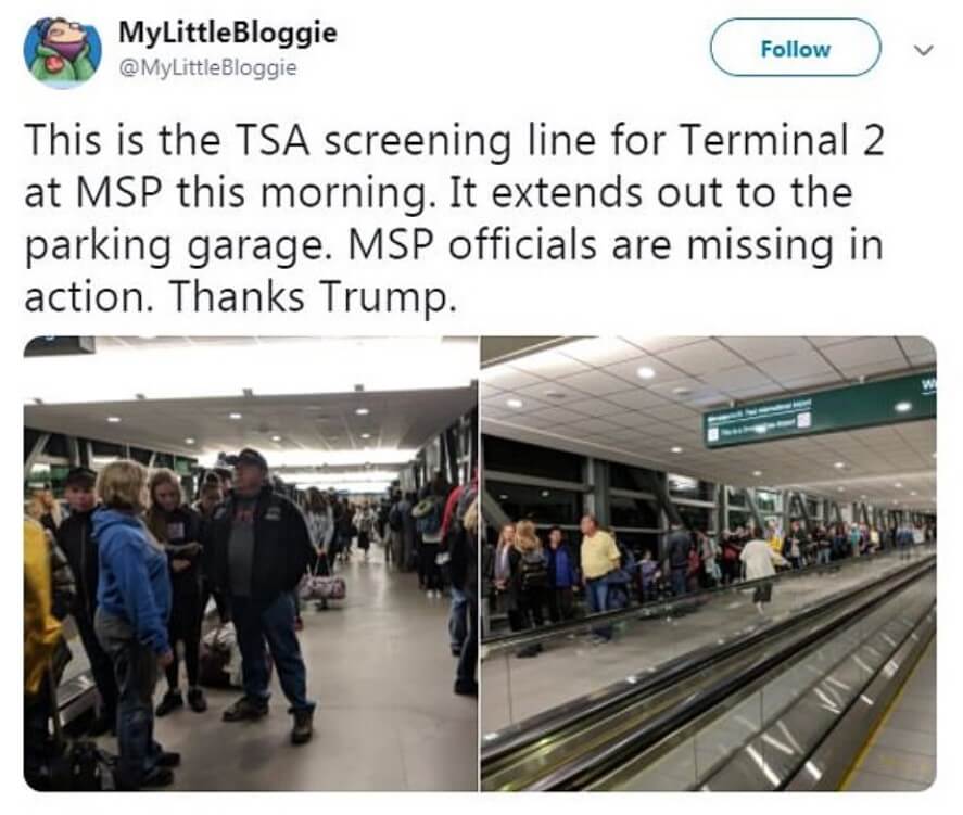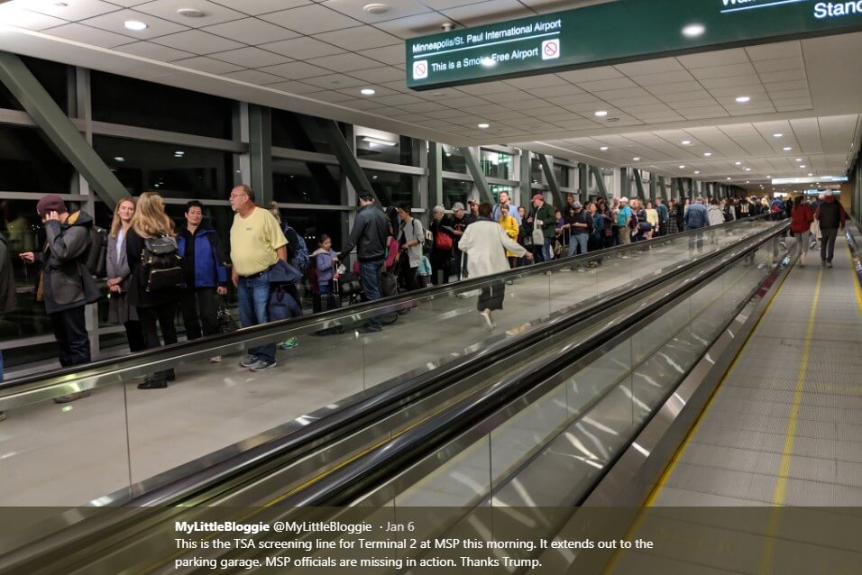 Некоторые пассажиры в международном аэропорту Minneapolis–Saint Paul делились фотографиями очередей. Одна из пользовательниц Твиттера написала, что «спросила агента TSA, стоит ли мне достать ноутбук из чехла, и она сказала — мне безразлично, мне не платят». Произошло это в том же аэропорту.