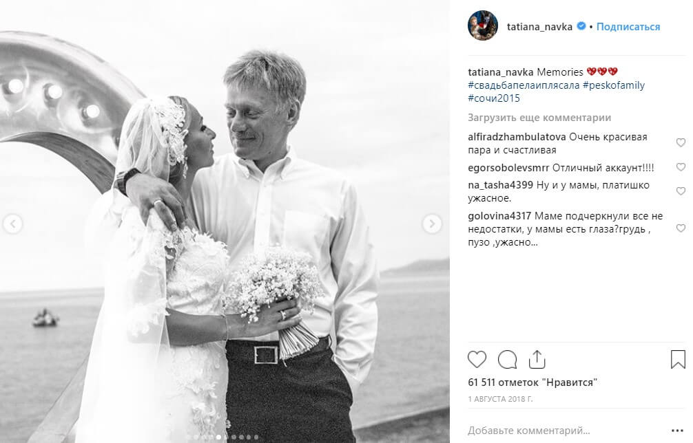 На свадьбе Пескова с Навкой 1 августа 2015 года фотограф запечатлел наручные часы пресс-секретаря президента РФ стоимостью 620 тыс. долларов. После роскошной свадьбы Песков с Навкой отправился в свадебное путешествие вместе с родственниками, друзьями и детьми на роскошной яхте Maltese Falcon у берегов Сардинии. Аренда яхты стоит 385 тыс. евро в неделю. Как писал Навальный, Пескову нужно выложить полностью свою зарплату за 3 года, чтобы позволить провести на этой яхте всего 7 дней.
