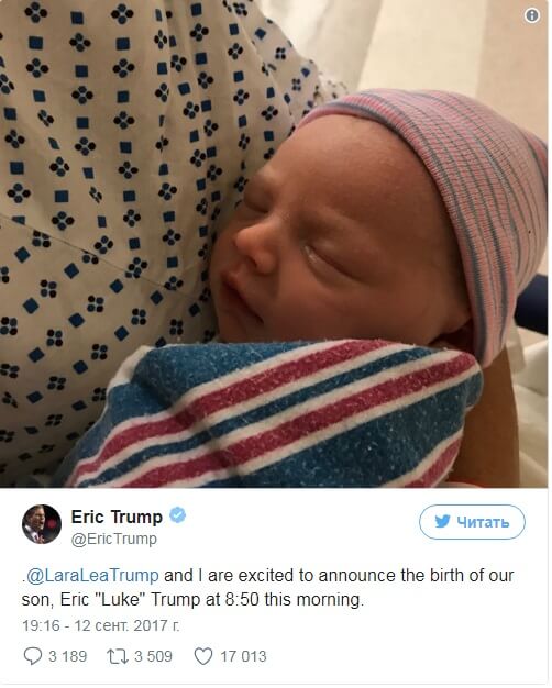 «Лара и я счастливы сообщить о появлении на свет нашего сына, Эрика Люка Трампа, который родился сегодня утром в 8.50», — написал сын президента в Twitter.