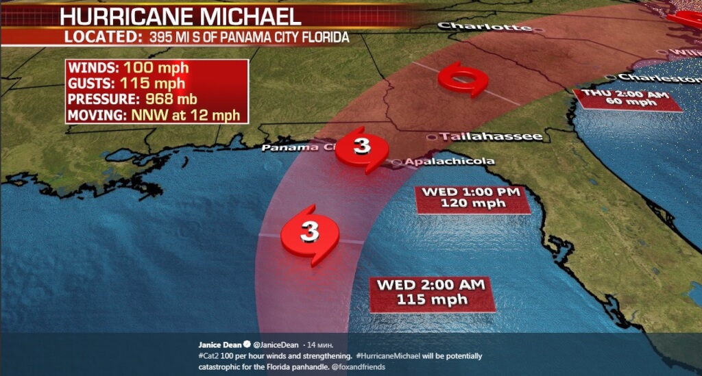 В настоящее время он считается ураганом 2 категории. Майкл может усилиться до 3 категории, став вторым крупным ураганом в Атлантическом бассейне в этом году после Флоренс в прошлом месяце, сказали синоптики.