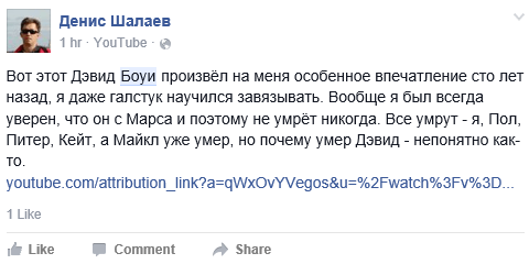 Mikhail Shabunov: Все как всегда. Стоит кому помереть, так сразу все о нем вспоминают, цитируют, восхищаются. Жалко Девида Боуи, конечно. Крутой был, что говорить. Правда теперь ему все равно, кто и что о нем думает.