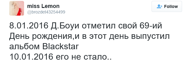 Я не умею писать крутые твиты, но. Дэвид Боуи, мы будем помнить такую легенду вечно! Я ухожу в запой.
