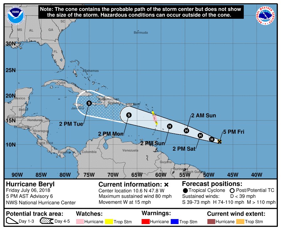 Ожидается, что завтра скорость Берила будет 161 км в час и начнет ослабевать уже на следующей неделе, как только достигнет Карибского моря.