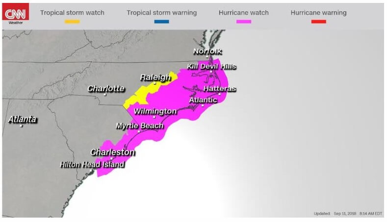 Юго-восточное побережье Соединенных Штатов готовится к урагану Флоренс, поскольку ожидается, что ураган усилится до 5 категории, прежде чем выйти на берег в четверг ночью, пишет CNN.