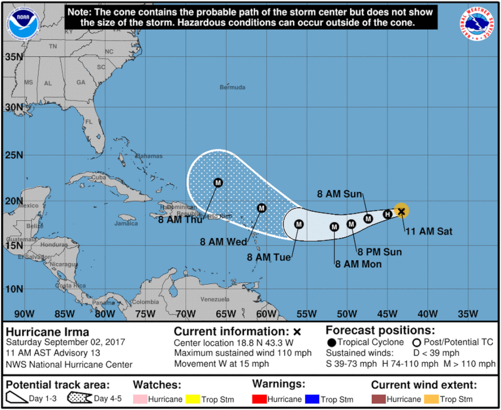 В Национальном центре ураганов сказали, что устойчивые ветра Ирмы продолжают достигать 117 км в час в 11 утра субботы. Ожидается, что ураган все еще будет оставаться мощным на протяжении всех выходных.