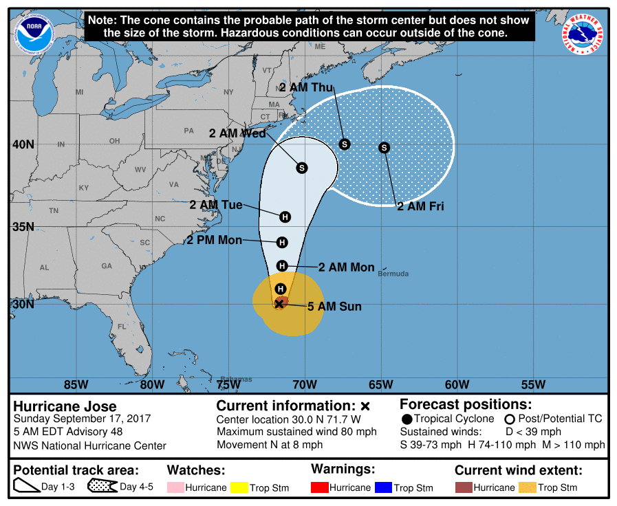 Latest NHC advisory on #Jose keeps center east of our area, but could still be rain/wind here late Tuesday. #abc7ny pic.twitter.com/gc61eprjYu