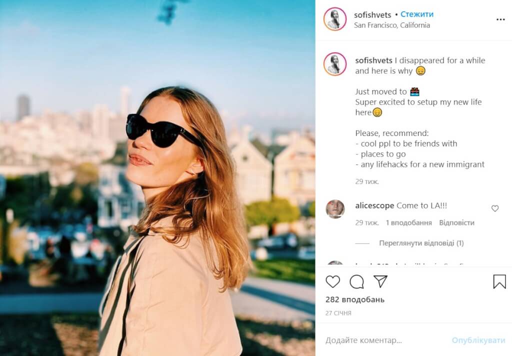 Я переехала в США четыре месяца назад, за несколько часов до начала карантина. Сейчас я живу в Сан-Франциско. Это новый интересный этап для меня. Переезд был осознанным решением, потому что подготовка моей визы — О1 — заняла где-то 8 месяцев. Такая виза дается людям с чрезвычайными способностями или достижениями. Поэтому надо доказать, что то, что я делаю, действительно выдающееся. Показателями этого являются проявления в медиа, инвестиции, участие в международных программах.
