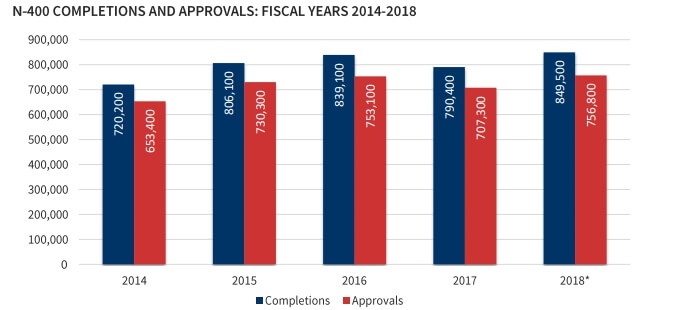 Процесс натурализации в 2018 финансовом году прошли 756 800 человек, что на 16% больше, чем в 2014 году, при этом уровень одобрения обработанных заявок несколько снизился — чуть ниже 90%. Иностранный гражданин должен быть законным постоянным жителем Соединенных Штатов в течение не менее пяти лет, прежде чем подавать заявление на получение гражданства.