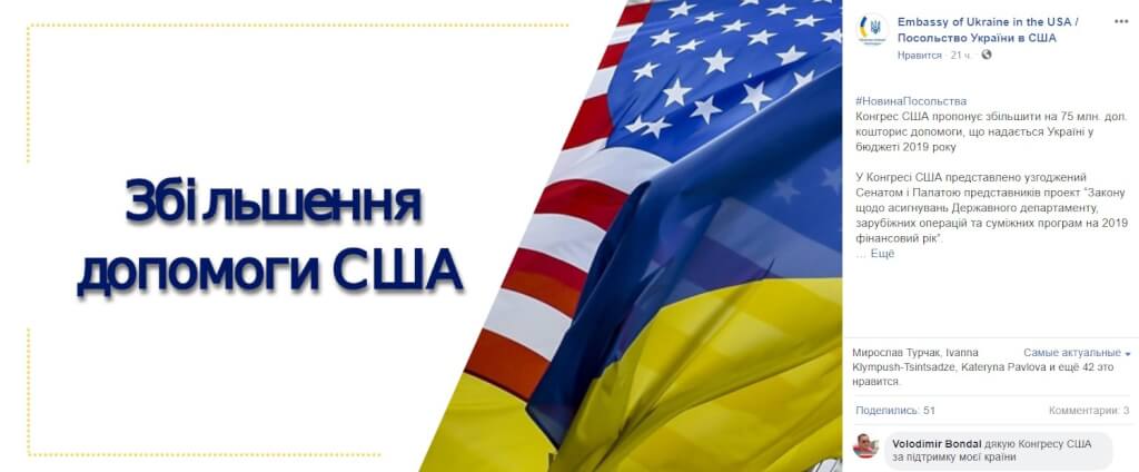 Конгресс США предлагает увеличить на $75 млн объем помощи, предусмотренной для Украины в 2019 году. Об этом сообщает посольство Украины в США на своей странице в Facebook.