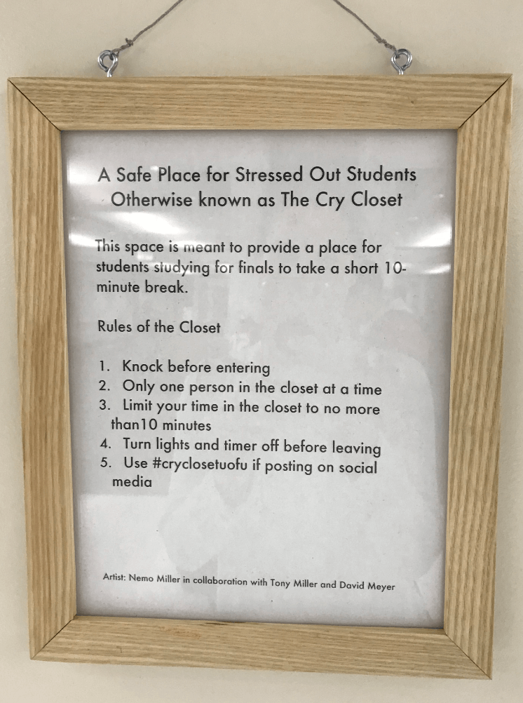 Созданный студентом Университета штата Юта и художником Немо Миллером, «шкаф для слез» имеет черный интерьер с плюшевыми игрушками, которые студенты могут обнимать и прижимать к себе, когда плачут.
