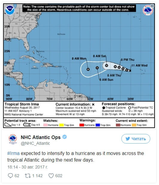 Шторм набрал силу менее чем за день после формирования. По данным метеорологов, Ирма не представляет непосредственной угрозы для суши, однако еще слишком рано говорить о ее дальнейшей траектории движения.