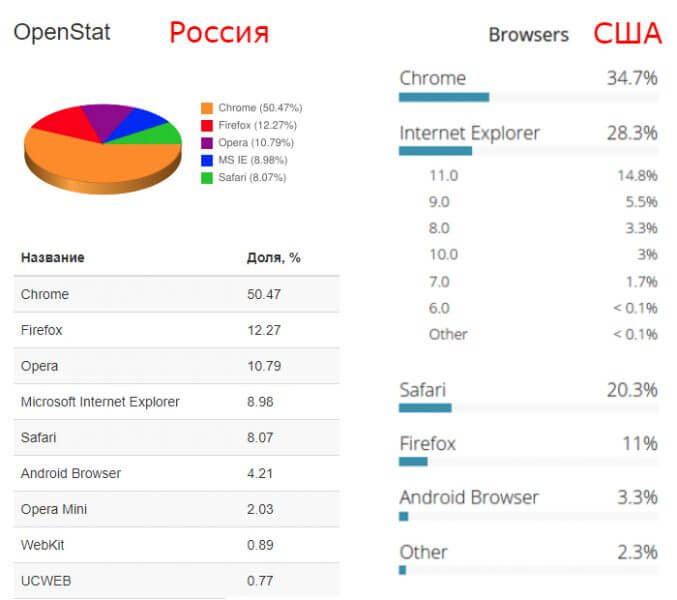Чтобы вы лучше понимали, о чём идёт речь, я покажу вам статистику популярности браузеров в России и в США за 2015 год: