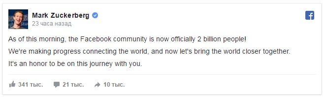 Число активных пользователей в месяц соцсети Facebook выросло до двух миллиардов. Об этом 27 июня 2017 года рассказал основатель компании Марк Цукерберг.