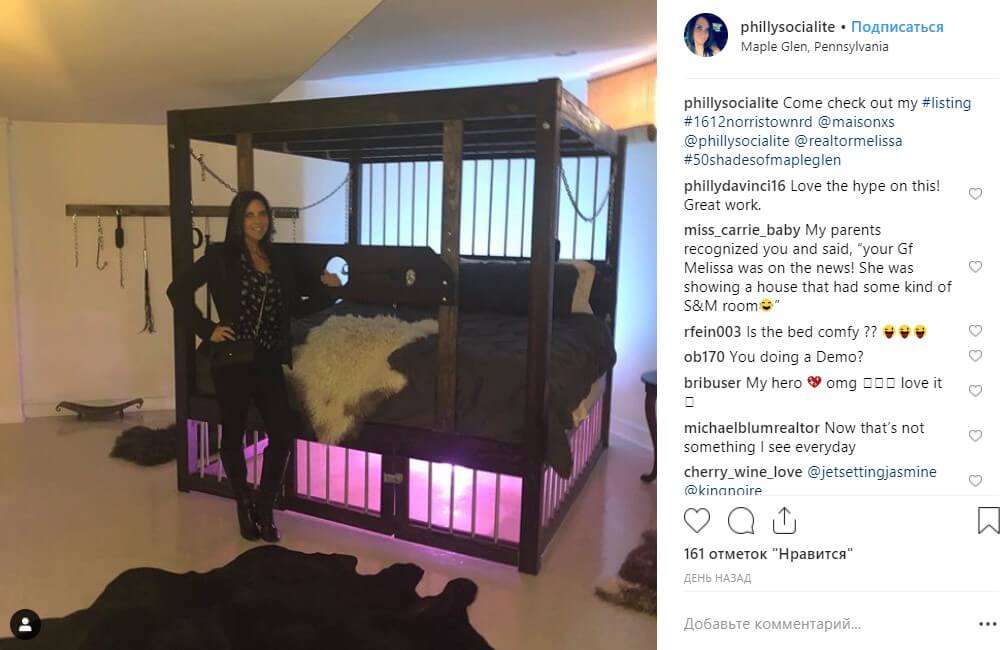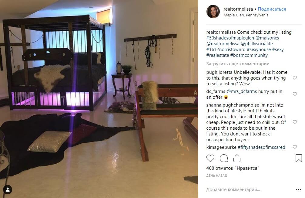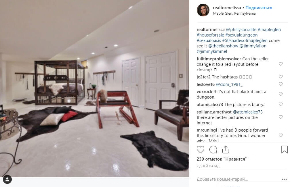 В пригороде Филадельфии выставлен на продажу роскошный загородный дом элитного класса, в котором, помимо разнообразных удобств, оборудован подвал, который очевидцы сравнили с комнатой из книги и серии фильмов «Пятьдесят оттенков серого». Фото и видео из подвала стали вирусными в Интернете — и это очень раздражает соседей.