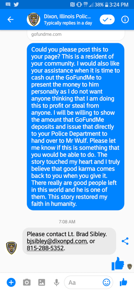 Дженни Келлер из Рокфорда узнала об этой истории и хотела сделать что-то хорошее для Вульфа. Она открыла страницу по сбору средств на платформе GoFundMe для него с целью собрать пожертвований в $1000.