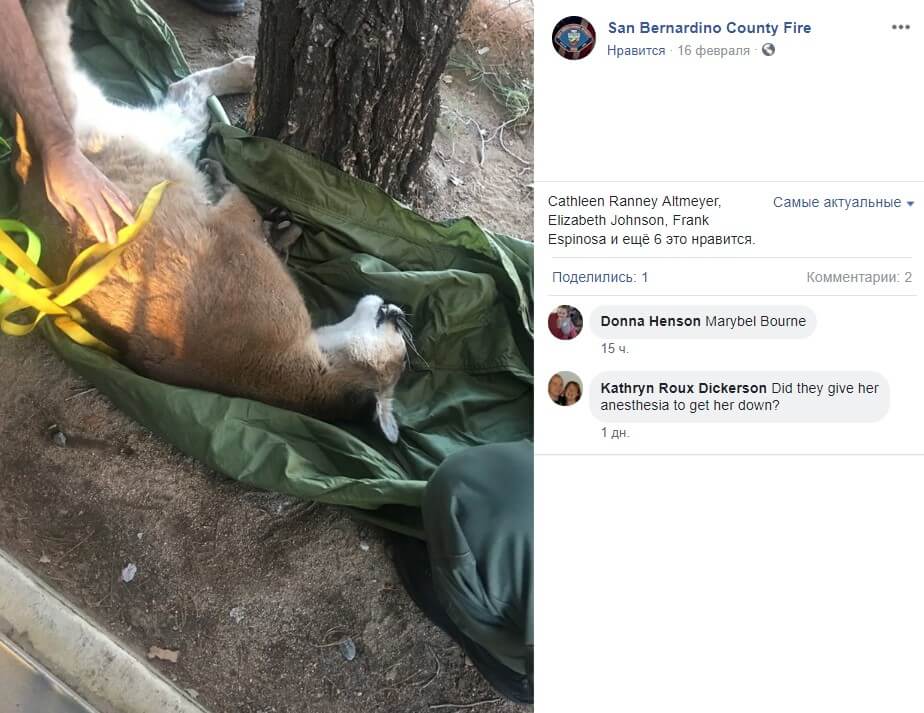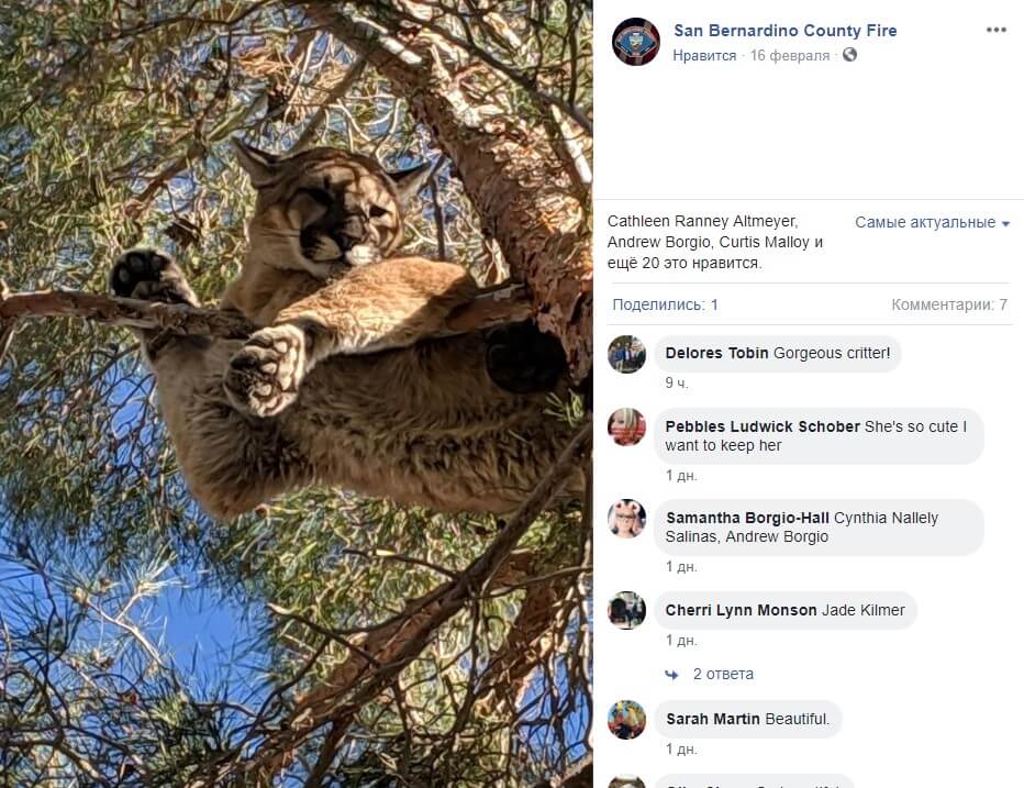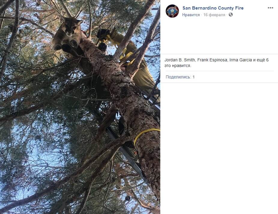 Пожарные округа Сан-Бернардино в Южной Калифорнии спасли гигантскую кошку — горного льва, или кугуара. Животное забралось на дерево возле жилого дома недалеко от горной гряды и не смогло самостоятельно спуститься — как это и бывает с кошками, даже большими и дикими.