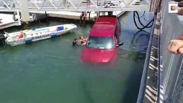 Грузовик упал в воду на пристани на Лонг-Бич и стал уходить под воду. Спасатели и свидетели происшествия, не раздумывая, прыгнули в воду, чтобы помочь людям, которые находились внутри транспортного средства.